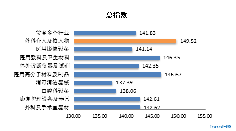 数据显示,所处不同子行业受访者对中国医疗器械总信心指数均较高,而外科介入及植入物行业的受访者总信心指数最高,是149.52。其次为医用高分子材料及制品行业的受访者为146.67;第三为医用敷料及卫生材料行业的受访者,为146.35.