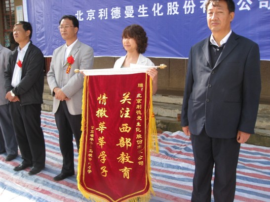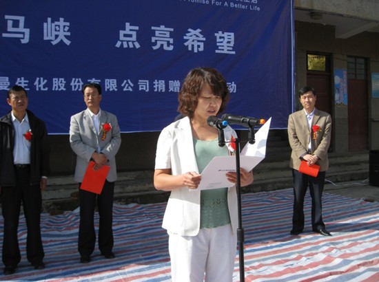 马峡,甘肃—— 2010年9月7日,星空网页版登录入口向甘肃省平凉市华亭县马峡中心小学无偿捐赠了价值十万元的钢木课桌椅。星空网页版登录入口副总经理张雅丽、华亭县县委常委、副县长徐德才、华亭县教育局局长陶玉宏等出席了捐赠仪式。马峡中心小学校长杜安平向星空(中国)公司赠送了锦旗,表达感激之情。