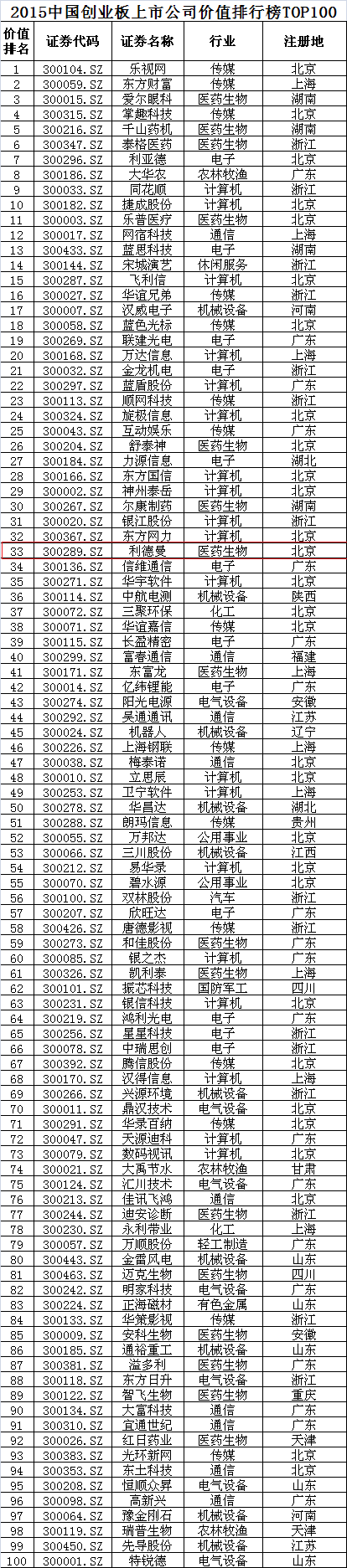 附表:《2015中国创业版上市公司价值排行榜TOP100》名单